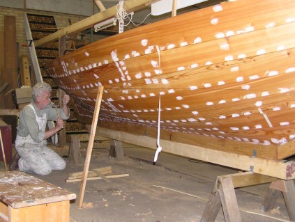 "Vi Sejler Videre" er på forkant med næste sæson - Kurt og Lillan får sig lige en passiar inden bugthøvlen gør arbejdet færdigt. To friske tynde granrafter bliver til topsejlsmaster ... i løbet af vinteren hængt til lufttørring i Sjægtemagasinet i Kølsen.