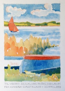Gave til Viborg Sejlklub ved reception i anledning af klubbens 75 års jubilæum. Her fandt denne fine akvarel af Ole Utoft hurtigt sin plads på væggen i Klubhuset.