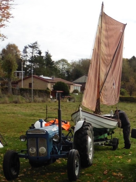 At få "Godtfred" på land er "et stykke kage", når man har traktor og trailer ! Bare ikke lige Sørens morgen: - ingen strøm på hans Fordson Dexta ! - og efter et skud strøm skulle den så "lige stå i tomgang og lade" - gik så i stå igen - ingen diesel ! Nu er tanken fuld og Søren er klar til på lørdag, når der skal trækkes trailere for alvor.
