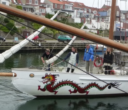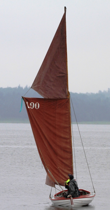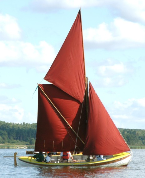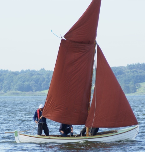 Fokken fra sjægten Boline blev brugt som forlænger på Connie's storsejl - alle m2 tæller. Sjægtegast "Faster Kirsten" og hendes mand Henrik passer henholdsvis klyver- og fokkeskøde.