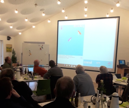 Orientering om Uge 28 turen til Lindesnes, LAG projektet "Fjordbase Hjarbæk", lidt fotos fra januarturen til Tirpitz museet og til slut brush-up i kapsejladsregler - så var alle mætte. Som det ses af foto var der både skærm og tavle igang.