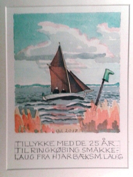 I anledning af Ringkøbing Smakkelaug's 25 års Jubilæum, har Sjægtelauget lykønsket med en af Ole Utoft's akvareller. Motivet er selvfølgelig fra Ringkøbing Fjord. Og nej - gummistøvlen er ikke en spøg - det er et dybt seriøst lokalt sømærke !